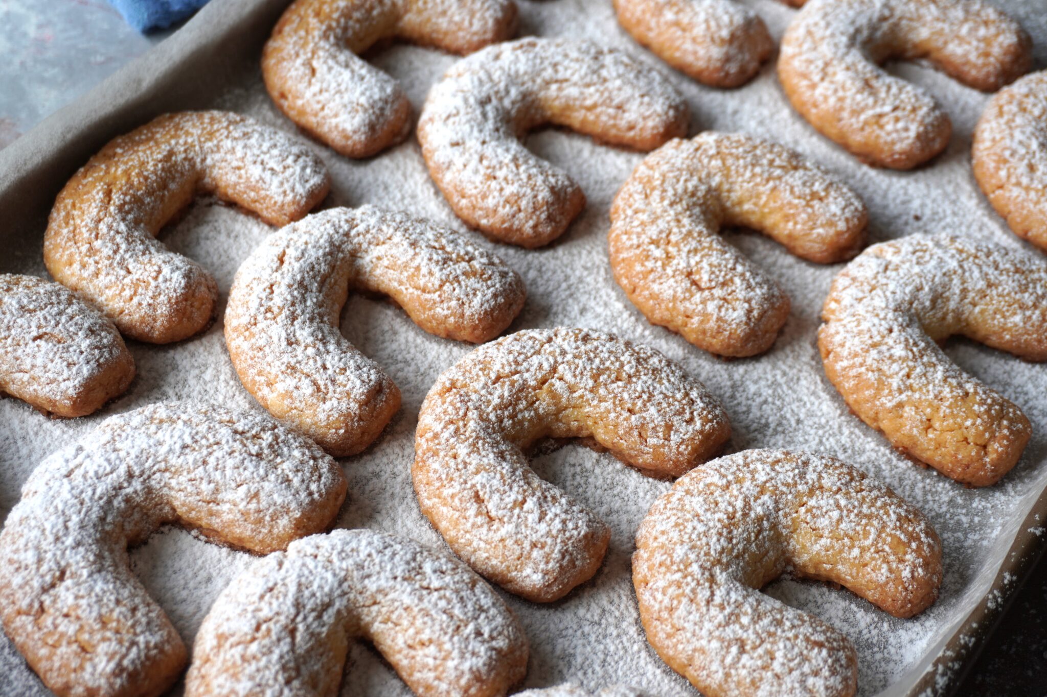 Soft, buttery crescents rolled in fine powdered sugar. A classic treat with delicate flavor and a tender crumb. Contains dairy.